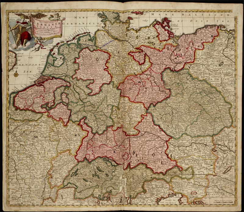 Titel der Karte: Nova et denuo correcta Germaniae tabula, comprehendens X circulos, Regnum Bohemiae, ac universum Helvetiam; cum coeteris regionibus in annexis / per Carolum Allard Amstelo-Batavum
