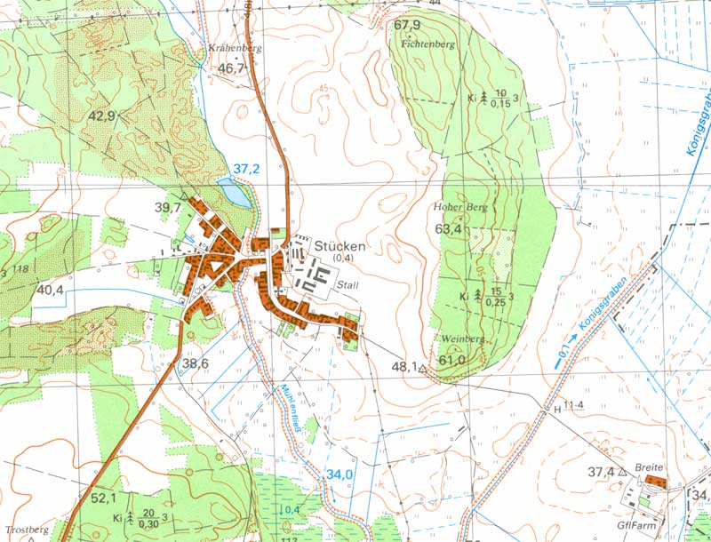Ausschnitt aus der Topographischen Karte 1 : 25 000, Ausgabe AS, zu DDR-Zeiten Vertrauliche Verschlusssache. Nutzer war ausschließlich das Militär, so sind viele Angaben enthalten, die für Bewegungen von militärischen Geräten wichtig sind. Das sind zum Beispiel: Baumdurchmesser, -abstände, -höhe und -art, Angaben zu Brücken und … … …