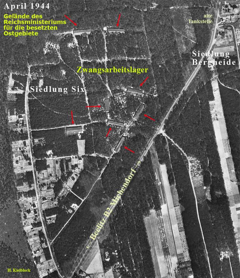 Die hier gezeigten Bilder sind ein erster Versuch den Ort, die Anlagen des Lagers an Hand von Luftbildern der Jahre 1944 und 1945 zu lokalisieren. Wir sehen hier schön die Entwicklung von April 1944 bis März 1945. Es wurde ständig weiter gebaut, vergrößert und der Beginn der Tarnung ist zu erkennen. Die 1945 gesprengten Bunker sind nicht zu sehen, gut getarnt. Die Eisenbahnschienen gehen nicht bis zum Objekt, sicher der geographischen Lage geschuldet. Am Ende der Strecke beginnt das Gelände "steil" nach oben zu gehen. Die Endmuränenkuppen versperren den Weg. Was wurde hier transportiert?